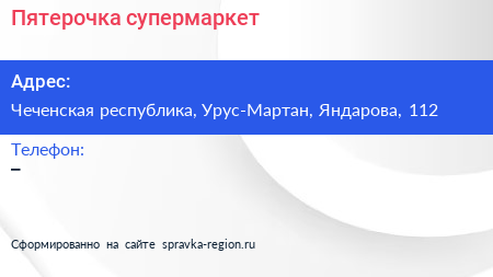 Пятерочка, супермаркет по адресу Чеченская республика, Урус-Мартан, Яндарова, 112 в дальнейшем Организация, размещена в следующих категориях: