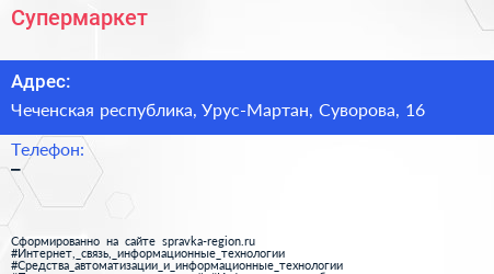 Супермаркет по адресу Чеченская республика, Урус-Мартан, Суворова, 16 в дальнейшем Организация, размещена в следующих категориях: