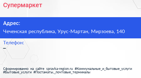 Супермаркет по адресу Чеченская республика, Урус-Мартан, Мирзоева, 140 в дальнейшем Организация, размещена в следующих категориях: