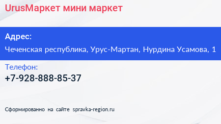 UrusМаркет, мини-маркет по адресу Чеченская республика, Урус-Мартан, Нурдина Усамова, 1 в дальнейшем Организация, размещена в следующих категориях: