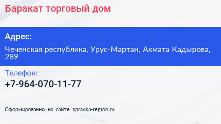 Баракат, торговый дом по адресу Чеченская республика, Урус-Мартан, Ахмата Кадырова, 289 в дальнейшем Организация, размещена в следующих категориях:
