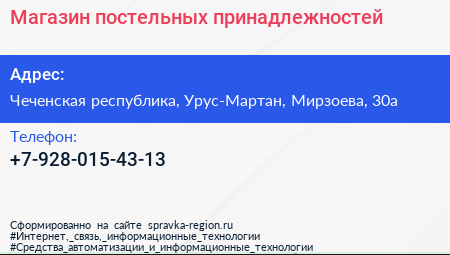 Магазин постельных принадлежностей по адресу Чеченская республика, Урус-Мартан, Мирзоева, 30а в дальнейшем Организация, размещена в следующих категориях: