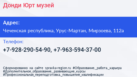 Донди-Юрт, музей по адресу Чеченская республика, Урус-Мартан, Мирзоева, 112а в дальнейшем Организация, размещена в следующих категориях: