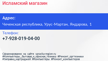 Исламский магазин по адресу Чеченская республика, Урус-Мартан, Яндарова, 1 в дальнейшем Организация, размещена в следующих категориях: