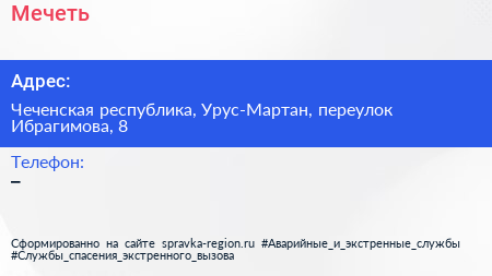 Мечеть по адресу Чеченская республика, Урус-Мартан, переулок Ибрагимова, 8 в дальнейшем Организация, размещена в следующих категориях: