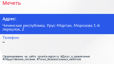 Мечеть по адресу Чеченская республика, Урус-Мартан, Морозова 1-й переулок, 2 в дальнейшем Организация, размещена в следующих категориях: