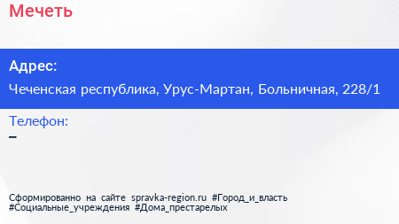 Мечеть по адресу Чеченская республика, Урус-Мартан, Больничная, 228/1 в дальнейшем Организация, размещена в следующих категориях: