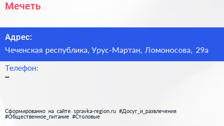 Мечеть по адресу Чеченская республика, Урус-Мартан, Ломоносова, 29а в дальнейшем Организация, размещена в следующих категориях: