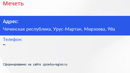 Мечеть по адресу Чеченская республика, Урус-Мартан, Мирзоева, 98а в дальнейшем Организация, размещена в следующих категориях: