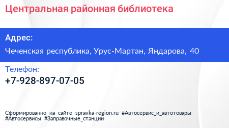 Центральная районная библиотека по адресу Чеченская республика, Урус-Мартан, Яндарова, 40 в дальнейшем Организация, размещена в следующих категориях: