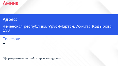 Амина по адресу Чеченская республика, Урус-Мартан, Ахмата Кадырова, 138 в дальнейшем Организация, размещена в следующих категориях:
