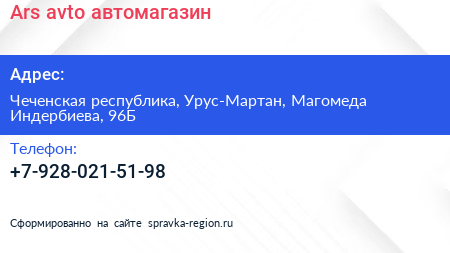 Ars-avto, автомагазин по адресу Чеченская республика, Урус-Мартан, Магомеда Индербиева, 96Б в дальнейшем Организация, размещена в следующих категориях: