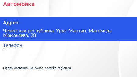 Автомойка по адресу Чеченская республика, Урус-Мартан, Магомеда Мамакаева, 28 в дальнейшем Организация, размещена в следующих категориях: