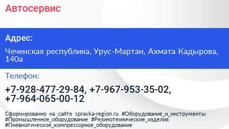 Автосервис по адресу Чеченская республика, Урус-Мартан, Ахмата Кадырова, 140а в дальнейшем Организация, размещена в следующих категориях: