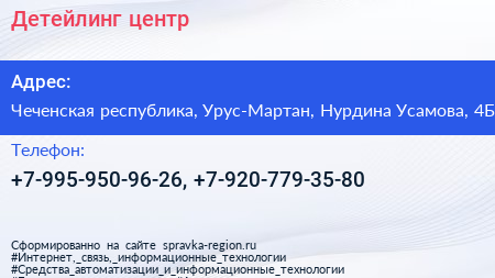 Детейлинг-центр по адресу Чеченская республика, Урус-Мартан, Нурдина Усамова, 4Б в дальнейшем Организация, размещена в следующих категориях:
