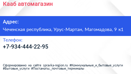 Кааб, автомагазин по адресу Чеченская республика, Урус-Мартан, Магомадова, 9 к1 в дальнейшем Организация, размещена в следующих категориях: