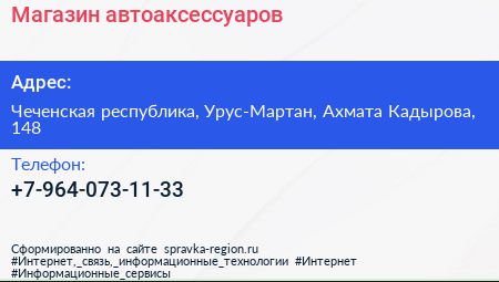 Магазин автоаксессуаров по адресу Чеченская республика, Урус-Мартан, Ахмата Кадырова, 148 в дальнейшем Организация, размещена в следующих категориях: