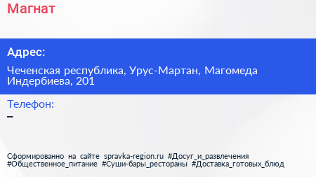 Магнат по адресу Чеченская республика, Урус-Мартан, Магомеда Индербиева, 201 в дальнейшем Организация, размещена в следующих категориях: