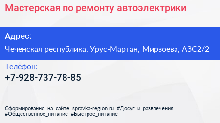 Мастерская по ремонту автоэлектрики по адресу Чеченская республика, Урус-Мартан, Мирзоева, АЗС2/2 в дальнейшем Организация, размещена в следующих категориях: