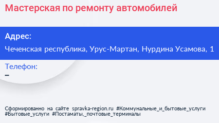 Мастерская по ремонту автомобилей по адресу Чеченская республика, Урус-Мартан, Нурдина Усамова, 1 в дальнейшем Организация, размещена в следующих категориях: