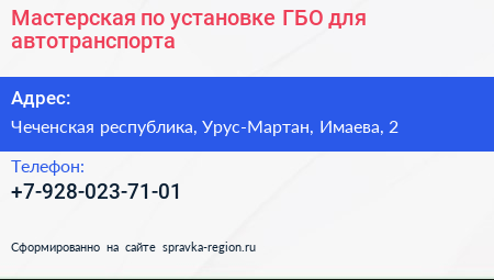 Мастерская по установке ГБО для автотранспорта по адресу Чеченская республика, Урус-Мартан, Имаева, 2 в дальнейшем Организация, размещена в следующих категориях: