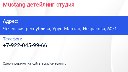 Mustang, детейлинг-студия по адресу Чеченская республика, Урус-Мартан, Некрасова, 60/1 в дальнейшем Организация, размещена в следующих категориях: