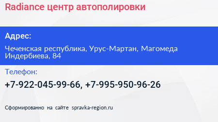 Radiance, центр автополировки по адресу Чеченская республика, Урус-Мартан, Магомеда Индербиева, 84 в дальнейшем Организация, размещена в следующих категориях: