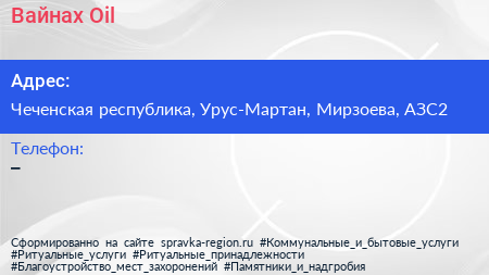 Вайнах Oil по адресу Чеченская республика, Урус-Мартан, Мирзоева, АЗС2 в дальнейшем Организация, размещена в следующих категориях:
