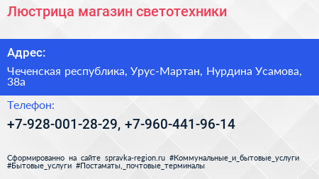 Люстрица, магазин светотехники по адресу Чеченская республика, Урус-Мартан, Нурдина Усамова, 38а в дальнейшем Организация, размещена в следующих категориях: