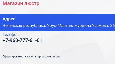 Магазин люстр по адресу Чеченская республика, Урус-Мартан, Нурдина Усамова, 36 в дальнейшем Организация, размещена в следующих категориях: