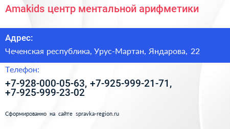 Amakids, центр ментальной арифметики по адресу Чеченская республика, Урус-Мартан, Яндарова, 22 в дальнейшем Организация, размещена в следующих категориях: