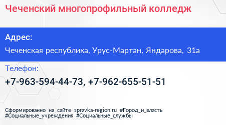 Чеченский многопрофильный колледж по адресу Чеченская республика, Урус-Мартан, Яндарова, 31а в дальнейшем Организация, размещена в следующих категориях: