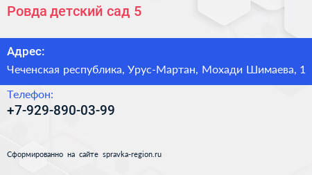 Ровда, детский сад №5 по адресу Чеченская республика, Урус-Мартан, Мохади Шимаева, 1 в дальнейшем Организация, размещена в следующих категориях: