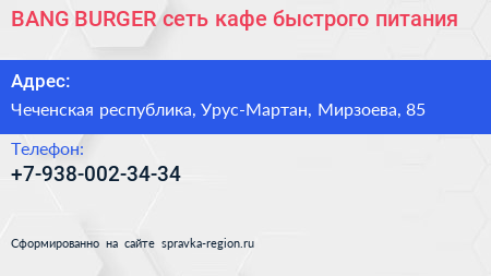 BANG BURGER, сеть кафе быстрого питания по адресу Чеченская республика, Урус-Мартан, Мирзоева, 85 в дальнейшем Организация, размещена в следующих категориях: