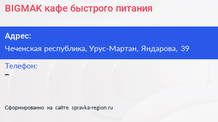 BIGMAK, кафе быстрого питания по адресу Чеченская республика, Урус-Мартан, Яндарова, 39 в дальнейшем Организация, размещена в следующих категориях: