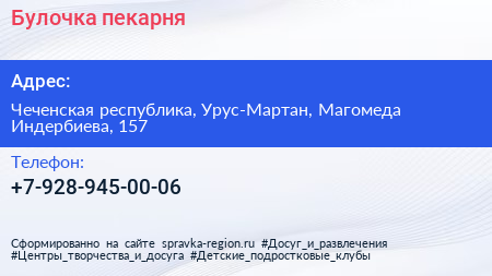 Булочка, пекарня по адресу Чеченская республика, Урус-Мартан, Магомеда Индербиева, 157 в дальнейшем Организация, размещена в следующих категориях: