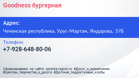 Goodness, бургерная по адресу Чеченская республика, Урус-Мартан, Яндарова, 57Б в дальнейшем Организация, размещена в следующих категориях: