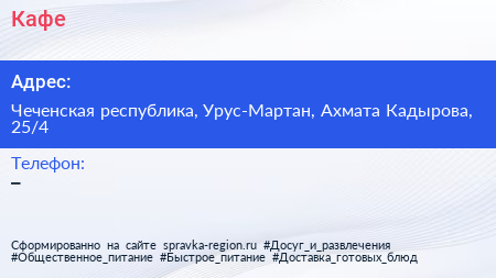 Кафе по адресу Чеченская республика, Урус-Мартан, Ахмата Кадырова, 25/4 в дальнейшем Организация, размещена в следующих категориях: