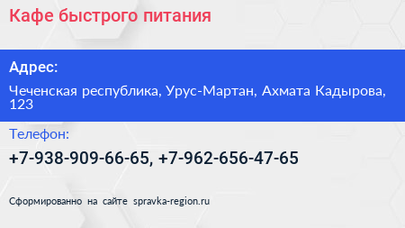 Кафе быстрого питания по адресу Чеченская республика, Урус-Мартан, Ахмата Кадырова, 123 в дальнейшем Организация, размещена в следующих категориях: