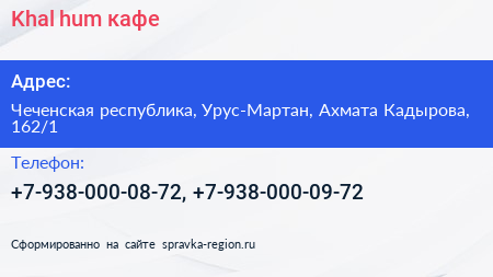 Khal hum, кафе по адресу Чеченская республика, Урус-Мартан, Ахмата Кадырова, 162/1 в дальнейшем Организация, размещена в следующих категориях: