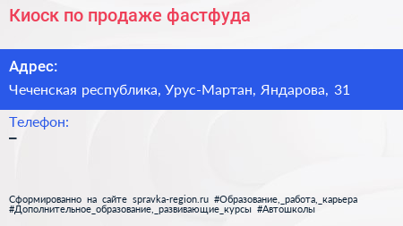 Киоск по продаже фастфуда по адресу Чеченская республика, Урус-Мартан, Яндарова, 31 в дальнейшем Организация, размещена в следующих категориях:
