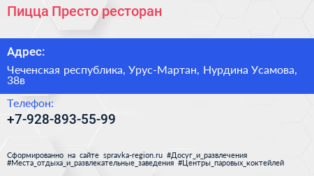 Пицца Престо, ресторан по адресу Чеченская республика, Урус-Мартан, Нурдина Усамова, 38в в дальнейшем Организация, размещена в следующих категориях: