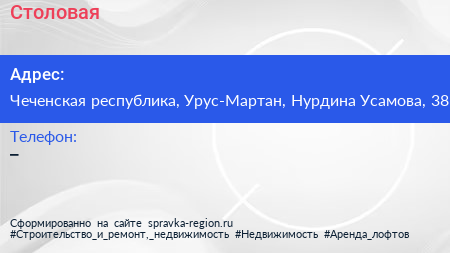 Столовая по адресу Чеченская республика, Урус-Мартан, Нурдина Усамова, 38 в дальнейшем Организация, размещена в следующих категориях: