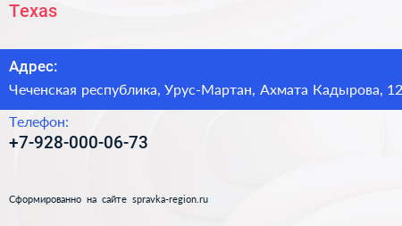 Texas по адресу Чеченская республика, Урус-Мартан, Ахмата Кадырова, 12 в дальнейшем Организация, размещена в следующих категориях: