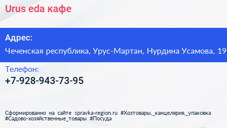 Urus eda, кафе по адресу Чеченская республика, Урус-Мартан, Нурдина Усамова, 19 в дальнейшем Организация, размещена в следующих категориях: