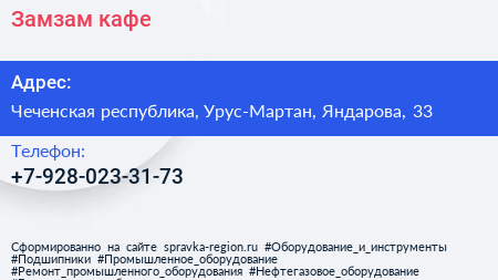 Замзам, кафе по адресу Чеченская республика, Урус-Мартан, Яндарова, 33 в дальнейшем Организация, размещена в следующих категориях: