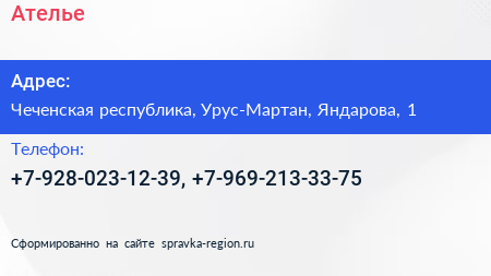 Ателье по адресу Чеченская республика, Урус-Мартан, Яндарова, 1 в дальнейшем Организация, размещена в следующих категориях: