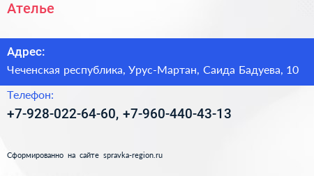Ателье по адресу Чеченская республика, Урус-Мартан, Саида Бадуева, 10 в дальнейшем Организация, размещена в следующих категориях: