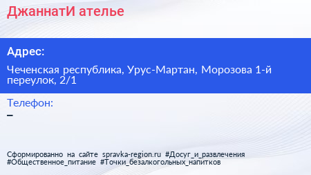 ДжаннатИ, ателье по адресу Чеченская республика, Урус-Мартан, Морозова 1-й переулок, 2/1 в дальнейшем Организация, размещена в следующих категориях: