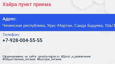 Хайра, пункт приема по адресу Чеченская республика, Урус-Мартан, Саида Бадуева, 10а/1 в дальнейшем Организация, размещена в следующих категориях: